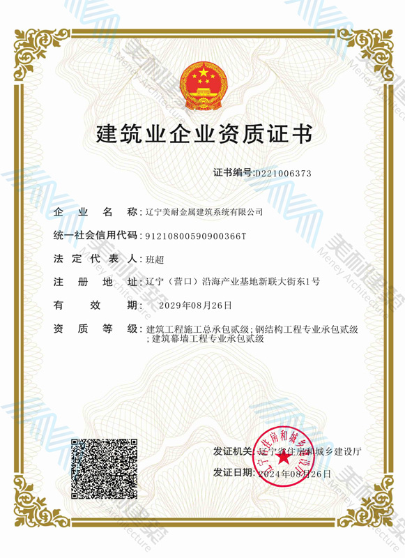 遼寧美耐金屬建筑系統有限公司位于遼寧(營口)沿海產業基地,專注于預制金屬建筑系統領域,是一家集工業建筑設計、制作、施工及相關的技術咨詢與服務為一體的綜合性服務企業。作為國家鋼結構協會會員、中國建筑金屬結構協會會員單位與國家高新技術企業,美耐建筑集建筑工程施工總承包、鋼結構工程專業承包等多種資質于一身,并擁有22項鋼結構建筑領域專利,9項軟件著作權。